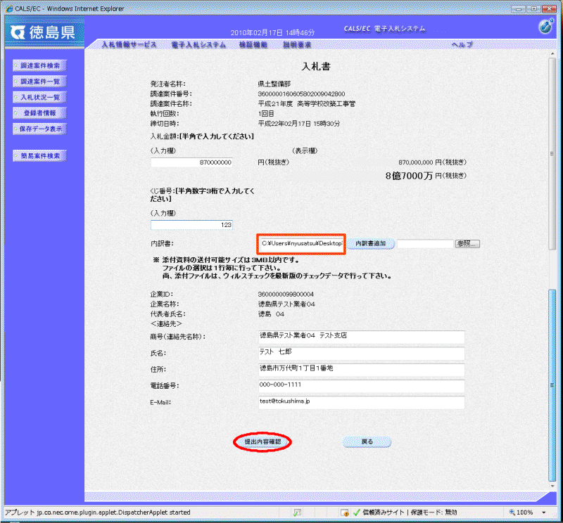 [内訳書追加]ボタンの左枠にファイルが追加されたことを確認し、[提出内容確認]ボタンをクリックします。