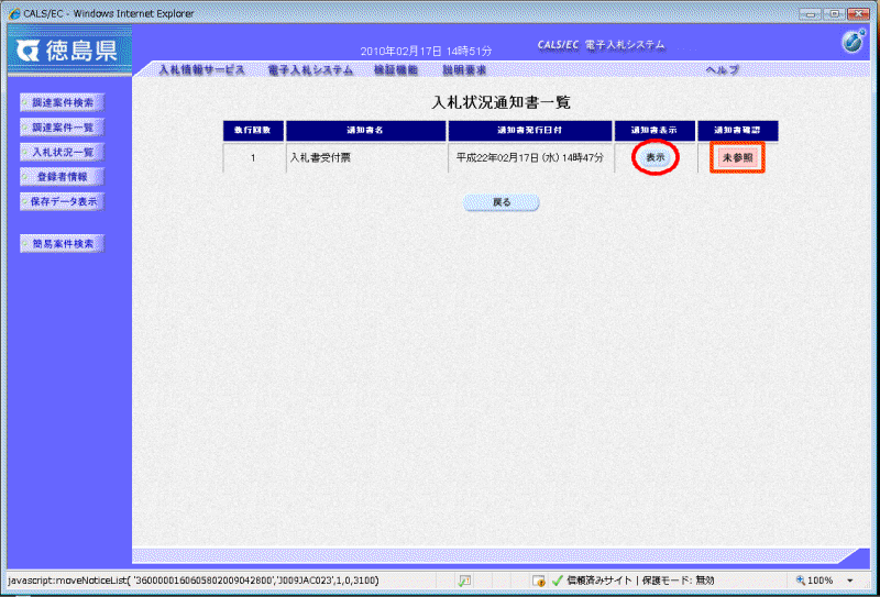 「入札書受付票」−「通知書表示」欄の[表示]ボタンをクリックします。